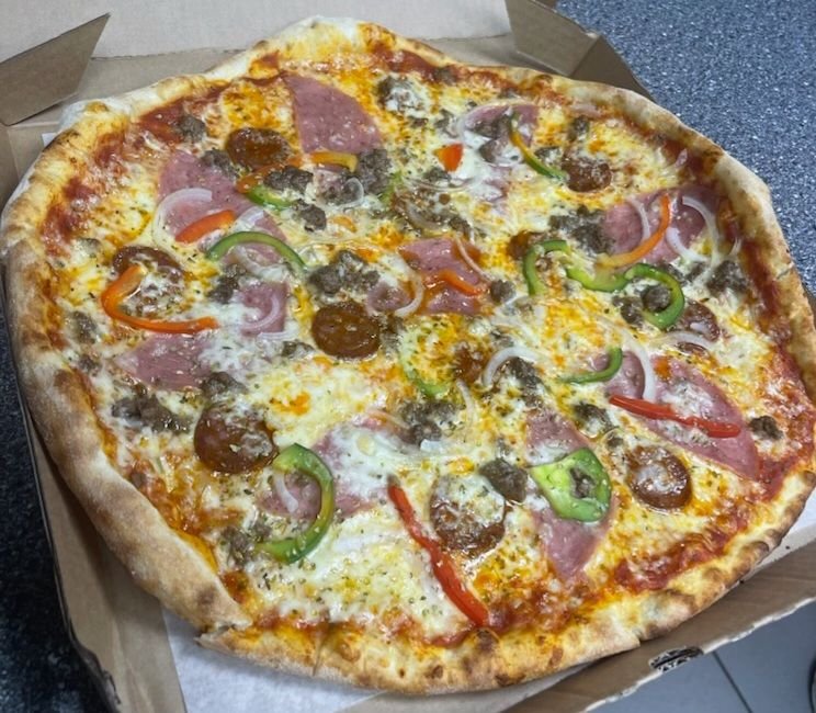 HÃ¥ndlaget bunn, saftig ost og smakfulle toppinger.